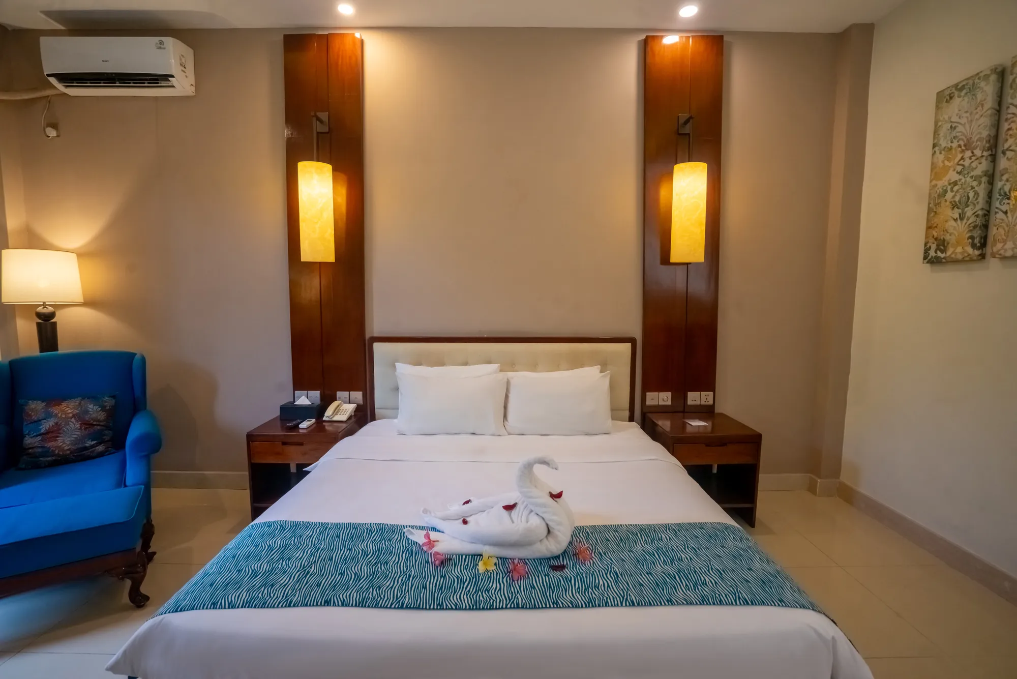 - Amenities: Air Conditioning, Bathrobe, Cable or Satellite TV, Coffee/ Tea Maker, Desk/ Work Area, Drinking water, Electrical adapters for international guests, Hairdryer (On request), High Speed Internet Access, Hot Shower, In-room safe, guests make their own code, Mini living room, , Room service 24 hours, Toiletries, Turndown service, Wake-up calls
